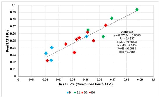Atmospheric correction has been validated with the Rrs obtained in situ. For this, the Rrs obtained during the 20 April 2023 field sampling has been convoluted to PerúSAT-1 bands. Figure 3 shows the correlation between PerúSAT-1 product data and Rrs in situ convoluted, with a relatively low error (RMSE = 0.093).