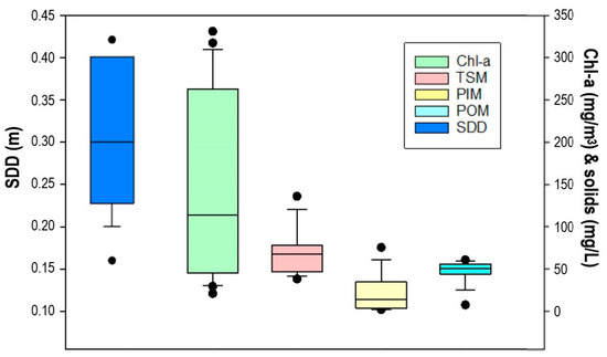 Particles present in the water column absorb and scatter light. A higher concentration of particles leads to increased scattering and therefore an increase in the turbidity of water bodies [7]. The TSM determined by filtration of water samples consists of inorganic particles (minerals, sand, etc.) as well as other organic particles (phytoplankton, detritus, etc. [8]. An increase in the TSM increases scattering and therefore the reflectance of a water body. This effect is especially noticeable in spectral regions where the absorption of other optically active constituents of the water body is low. There is a direct positive correlation between the reflectance in the red spectral region and the concentration of suspended solids in water due to their particle dispersion properties [9]. The Secchi disk depth (SDD) is used in limnological studies to estimate the extinction of light in water [10]. The SDD is inversely related to the amount of suspended matter in the water [11]. As water clarity decreases, brightness in the red spectral region usually increases [9].