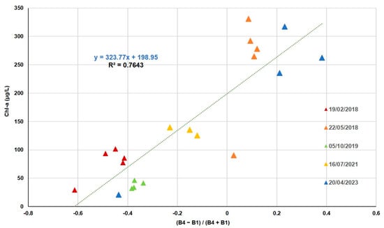 The 21 Chl-a values obtained from laboratory analysis range from 21 µg/L to 331 µg/L. Different indices combining two bands have normalized relative errors below 20% between the values measured in situ and the Rrs. ND using band 1 (blue) and band 4 (near infrared) is the combination that reaches the best correlation (Table 5) with the Chl-a fitted by the method of least squares to a linear fitting function (Figure 5).