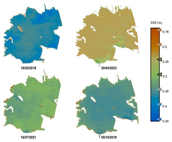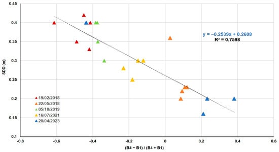 In Figure 6, we can observe the equation of the best linear fitting function with the method of least squares. It can be seen that the lowest values of SDD are those in which the values of Chl-a have reached their maximum (Figure 6), in the spring of 2018 and 2023.