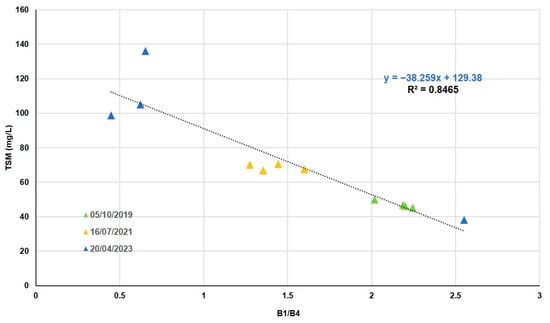 The 12 TSM values in the lagoon vary from 39 mg/L to 136 mg/L. Combining all the bands in different ways shows us that the best error is around 8%. The SR of bands 1 and 4 gave the best correlation with the TSM data measured in situ (Table 7). This correlation is obtained by the method of least squares to a linear fit function (Figure 7).