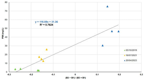 The 12 inorganic fraction values vary between 2 and 75 mg/L. The combinations of all the bands give errors of about 15% between the in situ values and those measured by the satellite. ND with band 3 (red) and band 1 (blue) is the combination that reaches the best correlation with the PIM field data (Table 8).
