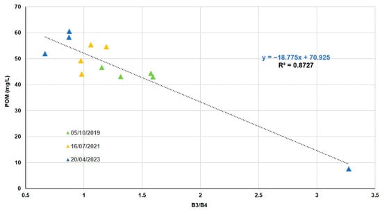 We could find in 12 values an organic fraction of the TSM from 7 to 60 mg/L. Different combinations using all the bands give us errors near 8%. With the SR of bands 3 (red) and 4 (near infrared), we obtained the best combination that reached the best correlation with POM field data (Table 9).