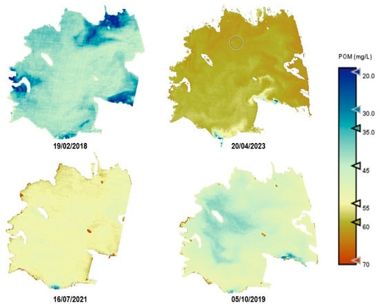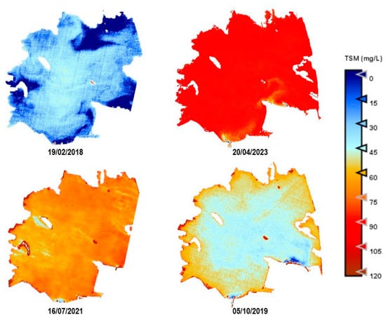 As can be seen in Figure 7, the increase in the amount of TSM present in the lagoon in the spring is noticeable in relation to the different time periods of the images.