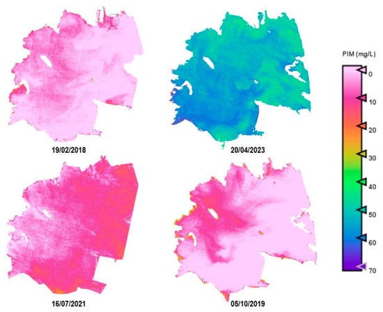 Estimation maps of PIM (mg/L). From left to right and up to down: winter, spring, summer, and autumn.