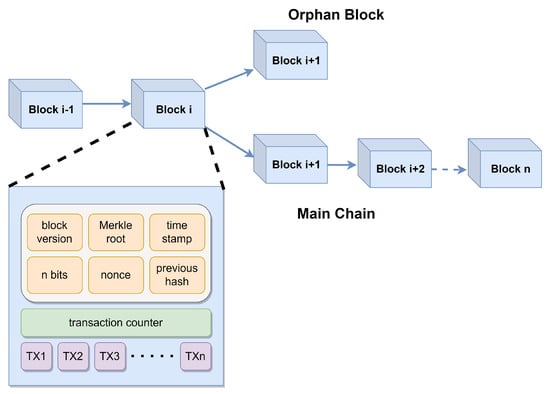 Another interesting concept in blockchain is forking [39]. At any given time, numerous nodes may concurrently validate and broadcast distinct yet valid blocks. When such parallel block creation occurs, conflicting blocks propagate across the network, leading to temporary inconsistencies in the ledger. Consequently, nodes may temporarily store divergent versions of the blockchain, with varying “latest” blocks in their local copies—a scenario termed the forking problem. To resolve this, blockchain protocols enforce a consensus rule where the longest valid chain is adopted as the authoritative version. Blocks in shorter chains are either discarded or labeled as orphaned blocks, ensuring eventual consistency across the network.