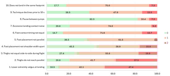 Values ranged from 0 to 2 for all technical flaws and for the total sample (including both elite and non-elite athletes), with item 1 “Lower extremity valgus at landing” presenting the worst most repeated value among all items analyzed (47.4% of players received a score of 2). In fact, almost 90% of all players involved in this study were categorized with small and large technical flaws for item 1, “Lower extremity valgus at landing”. The proportion of players categorized with technical flaws was also high for the items “Foot contact timing not equal” (85%) and “Does not land in same footprint” (82%) (Figure 1).