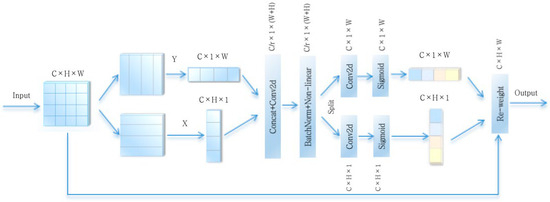 Coordinate information embedding: to effectively capture distant spatial interactions with accurate location details, the global average pooling is decomposed, and given the following input: F ∈ . The feature maps are pooled in both the X- and Y-directions using two pooling kernels—(H, 1) and (1, W)—to generate the feature maps of and . The feature maps are as follows: