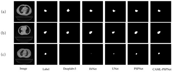 In Figure 3, the viewable area of the segmentation effect of PrivateLT is shown, and it can be seen that in the segmentation results of groups (a) and (b), the Deeplabv3, HrNet, UNet and PSPNet networks have the problems of unclear boundaries and large differences when compared with the labels, whereas the proposed CAML-PSPNet is able to more accurately segment the target, and it can obtain more consistent results in the segmentation of the tumor boundary, which proves the method is effective in solving the problem of unclear tumor boundaries. In the (c) group of segmentation visualization graphs, the Deeplabv3 network fails to segment the tumor location due to the small tumor region, the HrNet, UNet and PSPNet networks obviously have under-segmentation problems and the tumor edge segmentation is rougher, while CAML-PSPNet is able to segment the tumor region to a larger extent, indicating the effectiveness of the method for segmenting small targets. Compared with the existing popular segmentation models, the proposed algorithm has certain advantages.