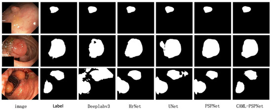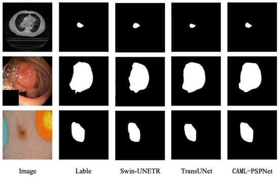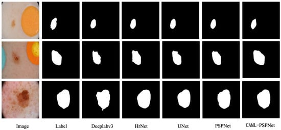 ISIC 2017 is a dermatologic dataset, and 960 dermoscopic images were selected for comparison experiments. Table 4 shows that the proposed algorithm surpasses other algorithms in the evaluation metrics of mIoU, mPA, Precision and Recall. From the segmentation visualization in Figure 5, the segmentation of the CAML-PSPNet network is closest to the labeled graph, especially at the edge of the tumor, where the segmentation effect is more accurate than other networks.