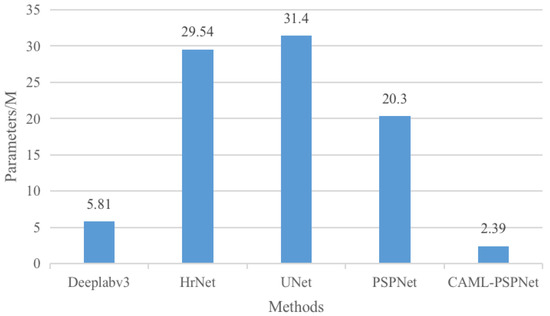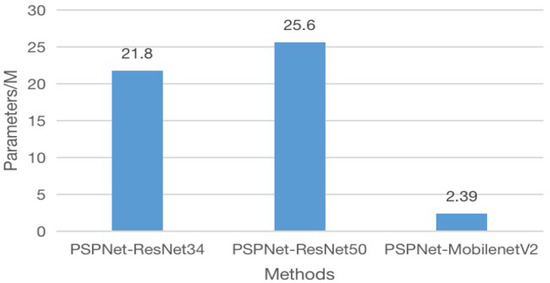In order to verify that the proposed network has the advantages of saving computational resources, the parametric counting for the model is carried out, and the parametric counting experiments were carried out on CAML-PSPNet and other networks, with the statistical results shown in Figure 8. In comparison with the Deeplabv3, HrNet, UNet and PSPNet networks, the proposed network CAML-PSPNet has only 2.39 M parameters, without this affecting the segmentation accuracy. To further verify that using MobileNetV2 as the backbone network can significantly reduce the number of parameters of the proposed model, Figure 9 shows the number of parameters of the proposed model when the backbone network is replaced with ResNet-34, ResNet-50, and MobileNetV2, respectively. The results indicate that the use of MobilenetV2 as the backbone network of the model is able to reduce the count of parameters of the model effectively and save a lot of computational resources.