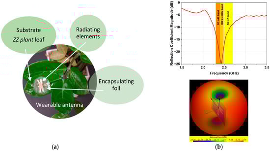 Application example of a wearable antenna on a substrate from a ZZ plant leaf: (a) photo of the antenna prototype; (b) measured reflection coefficient |S11| and 3D radiation pattern.