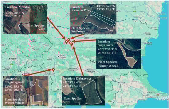 For the study, we collected leaves from three different plant species (corn, winter wheat, and sunflower) from five agricultural fields in Bulgaria. Figure 2 illustrates the GPS coordinates of the field and the plant species.