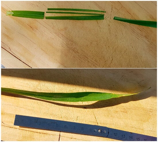 To prepare the sample, we detached a leaf from the winter wheat in the agriculture field and placed it on a wooden plate. Next, we used a blade to cut a rectangular sample from each leaf, as shown in Figure 3. Before cutting the samples, we measured and recorded leaf length, width, and thickness. Each sample is prepared immediately before measuring its electromagnetic parameters. We used the same procedure to prepare the samples from corn and sunflowers. Moreover, for each measurement, soil relative humidity was determined using a Testo 440 dP (Testo Ltd., Alton, UK) and a robust humidity/temperature probe (high-precision temperature/humidity probe 0636 9775, Testo Ltd., UK).