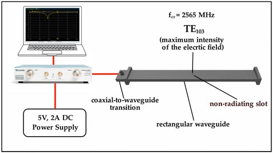 Figure 4 depicts the block diagram of the experimental setup. To measure the complex permittivity of fresh leaves, we used a TE103 rectangular cavity resonator (with dimensions in millimetres 610.0 × 61.0 × 10.0) formed by a section of rectangular waveguide with short-circuited one end and an iris by the other end to connect to the coaxial–waveguide transition. To introduce the fresh leaf sample, we created two small non-radiating slots on the top and bottom surfaces of the cavity walls, positioning them at the location of the maximum intensity of the electric field. We connect a vector network analyzer (Tektronix TTR503A, Tektronix, Inc., Beaverton, OR, USA) to the coaxial waveguide transition to measure the S11 parameter and determine the resonant frequency. Before measuring S11, we calibrate the experimental setup by applying the Open-Short-Load calibration technique. This involved utilizing a Short, an Open, and a 50-ohm Load standard to eliminate any residual impedance from the cable. We establish the resonant cavity at the critical coupling. Additionally, we validate the experimental setup by measuring the complex permittivity of Teflon, obtaining measured values for the real and imaginary parts of the relative complex permittivity as 1.97 ± 0.02 and 0.0051 ± 0.0003, respectively. For the measurement of εr′ and εr″ of samples, we used the measurement procedure described in Section 2.2.1.