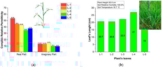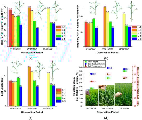 Figure 5a,b depict the results of measured real and imaginary parts of the relative permittivity in winter wheat leaves at three stages during growth (from Feekes 8 to Feekes 10.5) in the agriculture field near Blagoevgrad (see Figure 2). Figure 5c,d illustrate the height of plants and the length of winter wheat leaves during their growth. In Figure 5a–c, the leaves are labelled according to their position on the plant stem and relative to the soil (i.e., the first leaf close to the soil is L-1, the second leaf above it is L-2, and so forth). We used the same leaf number (L-1, L-2, etc.) throughout the observation period. For partially dried or dried leaves, permittivity is not measured.