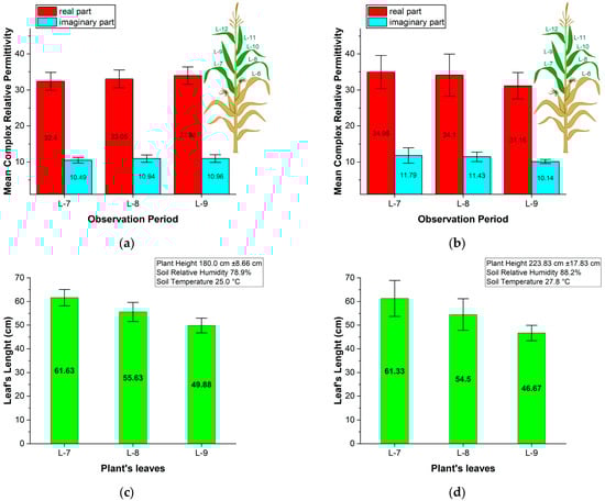 Figure 7a,b show the results of measuring the real and imaginary parts of the relative permittivity in corn leaves during the R5 growth stage, conducted in two agricultural fields near Mezdra and Dabrava (Figure 2). To assess the electromagnetic properties of corn leaves under harsh environmental conditions, specifically drought, we randomly selected ten corn plants from each agricultural field, ensuring that each plant had at least three green leaves. We labelled the leaves according to their position on the plant stalk and their proximity to the soil. The first leaf closest to the soil was labelled L-1, the second leaf above it was labelled L-2, and so forth. During our measurements, the corn plants were in the R5 (Dent) growth stage, characterized by dented kernels at the top of the ear, while the first six leaves (from L-1 to L-6) had dried out. We measured the relative complex permittivity of the green leaves labelled L-7, L-8, and L-9 from ten randomly chosen corn plants in each agricultural field. We also collected data on plant height and leaf length. Additionally, we displayed the standard deviation in Figure 7 to illustrate variability and repeatability.
