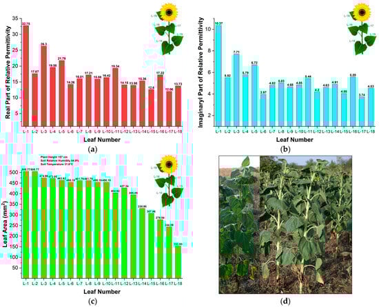 Results from measurements of sunflower leaves during the seed development stage in the agriculture field near Kameno pole: (a) Real part of the relative permittivity; (b) Imaginary part of the relative permittivity; (c) Leaf area, plant height, soil relative humidity and temperature; (d) Photos.
