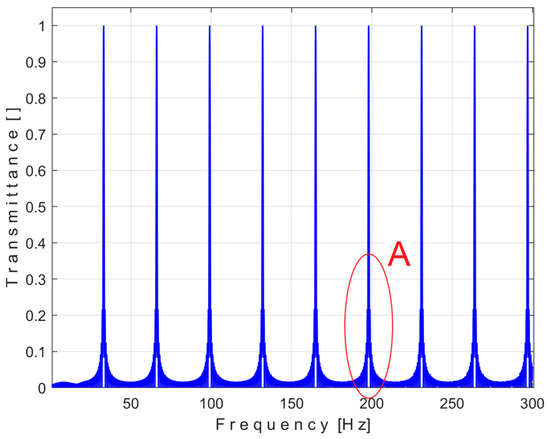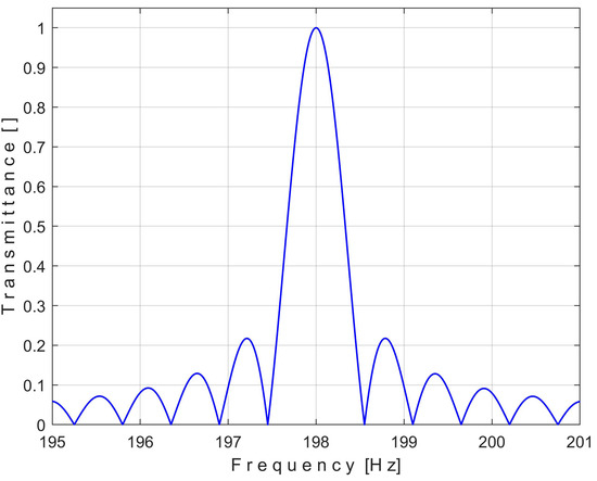 As clearly indicated in Figure 1, mainly the input signal components (sine waves) having j/T = j·33 Hz frequencies pass through the filter unaffected (with undiminished or canceled amplitudes). A zoomed-in detail in area A is depicted in Figure 2 (centered on the pass band frequency of 198 = 6·33 Hz). It is clear that the transmittance is not ideal (because of the small lateral lobes); however, this filter can be used acceptably for the extraction of periodic signal components, as the experimental results will show below.
