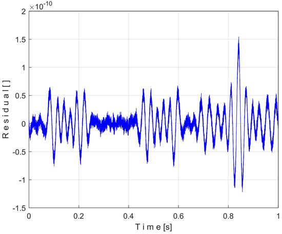 Figure 3 proves that this theoretical assumption (with the residuals represented as a line identical to t-axis) is not totally true for unknown reasons. However, the maximum peak-to-peak amplitude of the residuals (3 × 10−10) is extremely small, so it can be considered that the proposed EMASS and the filter described in Equation (3) work as presumed. This approach also confirms that the EMASS and the filter do not introduce any phase shift.