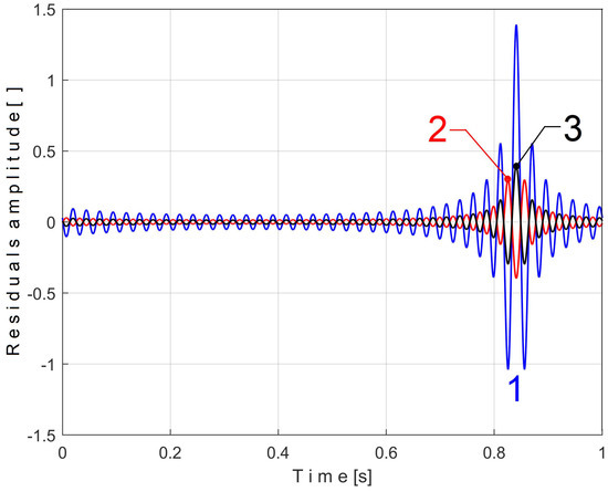 Obviously, the biggest peak-to-peak amplitude of the residual—and the better result for extraction and filtering—is obtained when = 0.5. Curve 1 from Figure 4 shows the worst-case time-domain representation of the residuals of the pattern extraction of the signal simulated in Equation (4), with T = 1 and Δt = 1/25,000.5 s when = 0.5. There is a 2.49 peak-to-peak amplitude of the residual.