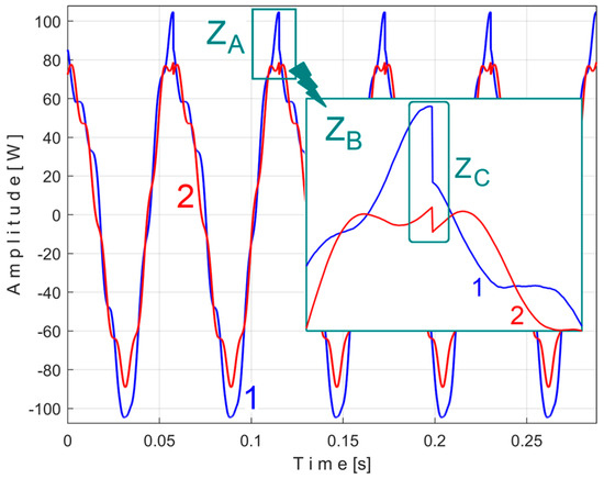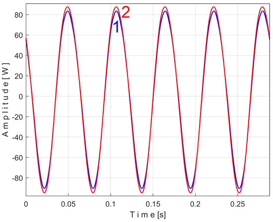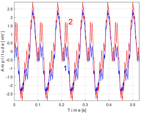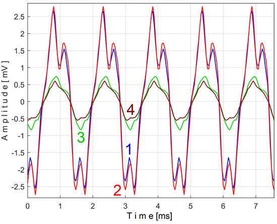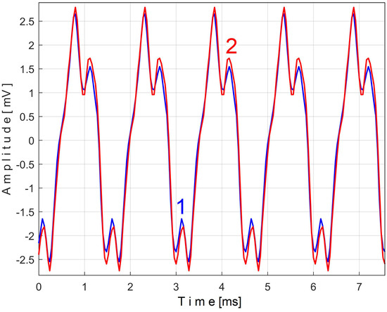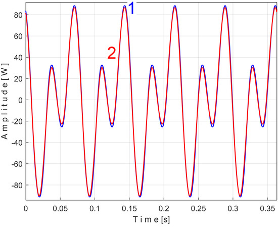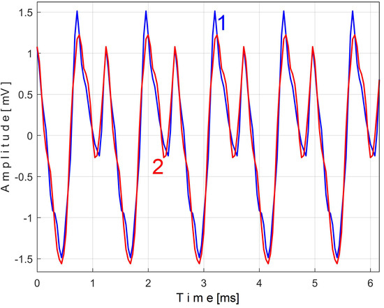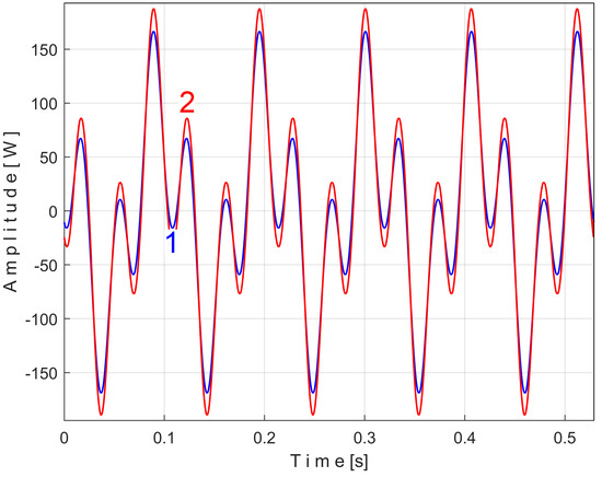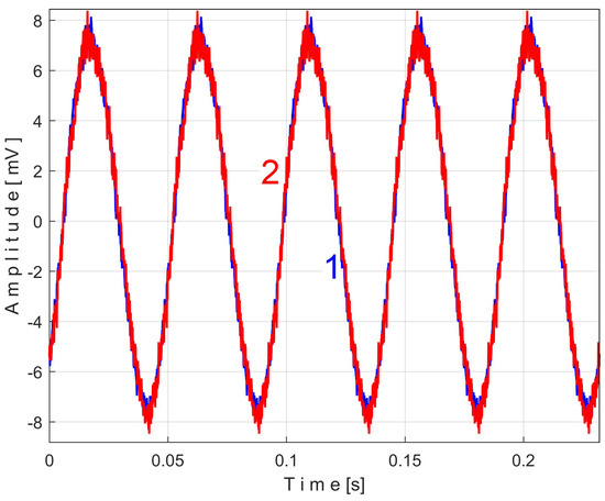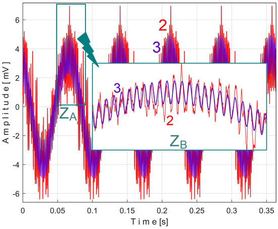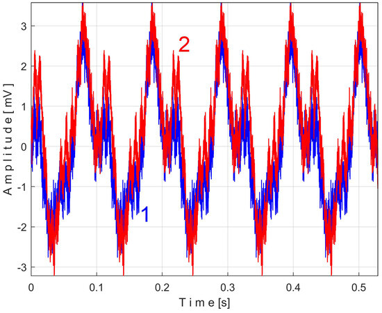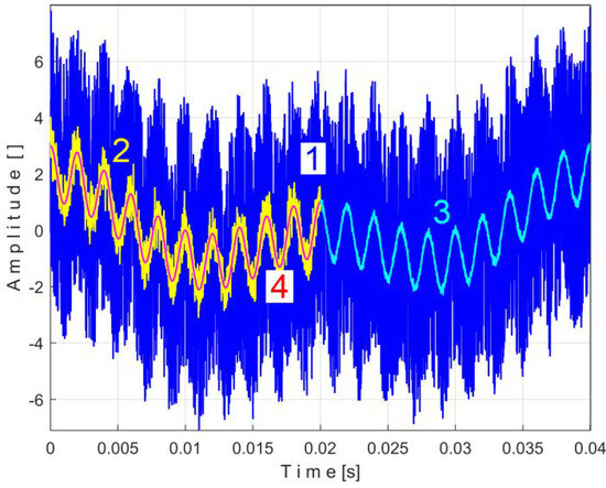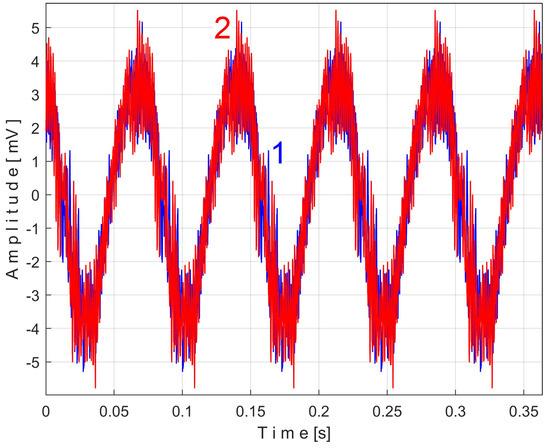 In Figure 5, curve 1 shows the result of the addition of signals rn + s during a period T = 1/25 s, where both simulated signals have the same sampling times Δt = 1/100,000 s.