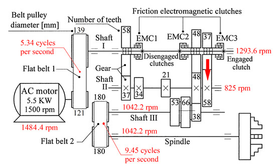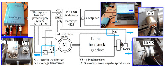An experimental setup already described in detail in [3] is used here (Figure 6 and Figure 7). As an electrically driven mechanical system (with a three-phase AC asynchronous motor), a lathe headstock gearbox is used (with the kinematic scheme partially shown in Figure 7). In this approach, three different state signals provided by appropriate sensors are considered relevant for condition monitoring purposes during a steady-state regime (at idle) of the lathe gearbox: the active electrical power Pa absorbed by the driving motor, the vibration signal vs., and the instantaneous angular speed IAS at the output spindle as signal Ias.