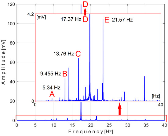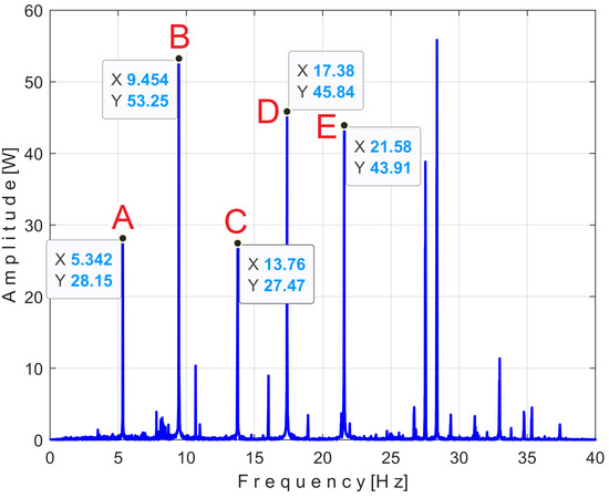 The FFT spectrum of Pav with A, B, …, E the fundamentals of PVSC generated by these MCs: A—the flat belt 1; B—the flat belt 2; C—the shaft II; D—the shaft III and the main spindle; E—the shaft I.