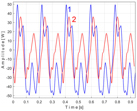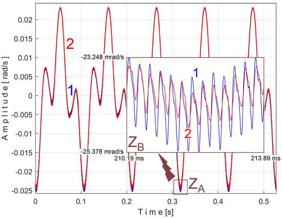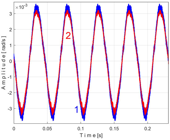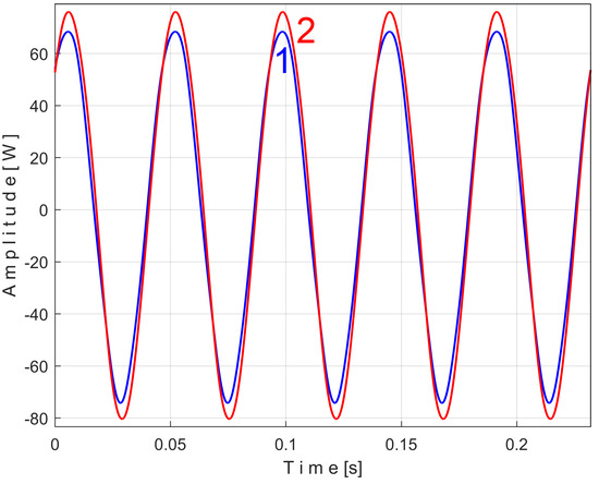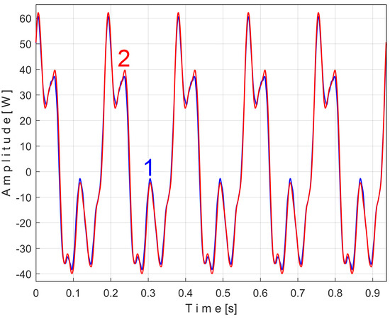 Similarly with Figure 11, Figure 14 shows the superimposed extended patterns sPTBe5a (curve 1, m = 935) and sPTBe5b (curve 2, m = 935) related to the PVSC generated by the flat belt 2. Each extended model is the result of applying EMASS on one half of the signal Pav (or sP as well). We found that the average frequency fPB to consider in EMASS for each extended pattern (which produces the maximum peak-to-peak amplitude of the pattern) is quite similar: fPBa = 9.45223 Hz for sPTBe5a and fPBb = 9.45981 Hz for sPTBe5b.