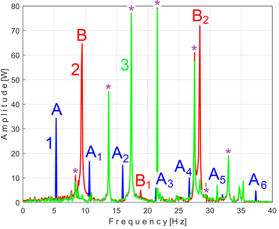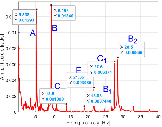 According to a study performed before [3], each of the labeled peaks (A, B, …, E) indicates the average frequency (inverse of the period) and the average amplitude of the fundamental sine wave of the PVSC generated by the flat belt 1 (A), the flat belt 2 (B), the shaft II (C), the shaft III and the spindle (D), and the shaft I (E). Some other significant peaks describe other sine waves as harmonics of these fundamentals. The frequency (and period as well) of some fundamentals and their harmonics may vary slightly here due to a slight variation in motor rotational speed.