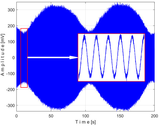 The time-domain representation of Pav is shown in Figure 9, with a zoomed-in detail (with 1.5 detail of 1.5 s duration from the beginning, shown in the rectangle on the right). This is a first simple proof that Pav is a deterministic signal with a very low level of noise. In the time-domain representation of Pav, many signals are mixed, most of them generated by the MC of the gearbox, as will be shown below.