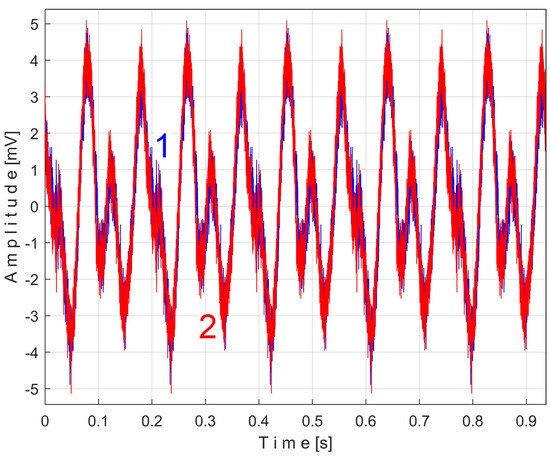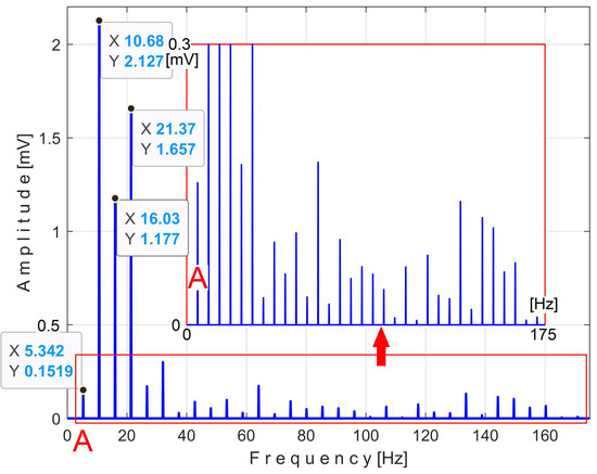 There is another important argument for the correctness of the proposed EMASS. Let us take a sequence of Pav with the duration of 50 periods TPA (234,300 samples for 9.372 s) from its beginning (as sP50). Correspondingly, the exact value of the frequency fPA = 5.33448 Hz and the extended pattern sPTAe50 were determined, with m = 50. In Figure 13, the FFT spectrum of the sequence sP50 (in the range 0–40 Hz) is marked as 1. The FFT spectrum of the signal sP1r50 resulting from the mathematical extraction of this extended pattern sPTAe50 from the analyzed sequence sP50 is marked as 2. The k-th sample of sP1r50 is described as sP1r50[k] = sP50[k] − sPTAe50[k]. It is clear that the fundamental A and its 6 harmonics (A1, A2, …, A6) have disappeared from the spectrum 2 as a result of the mathematical subtraction of the extended pattern sPTAe50 from the signal sP50. For any other area (except the blue peaks), the two spectra are identical (spectrum 2 is perfectly superimposed on spectrum 1).