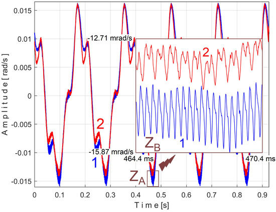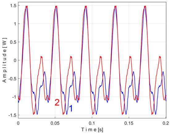 Figure 11 shows the superimposed extended patterns sPTAe5a (curve 1, m = 530) and sPTAe5b (curve 2, m = 530) related by the PVSC generated by the flat belt 1. We found that the average frequency fPA to consider in EMASS for each extended pattern (which produces the maximum peak-to-peak amplitude of the pattern) is slightly different: fPAa = 5.3368 Hz for sPTAe5a and fPAb = 5.3414 Hz for sPTAe5b. The beginning sample of the second half of the Pav signal (in a first approach pav/2) from which the second extended pattern (sPTAe5b) has been deduced is conveniently changed to obtain the most correct possible overlap of the two patterns. A characterization of the flat belt 1 behavior was obtained by means of the extended pattern shape, extracted by EMASS from Pav.