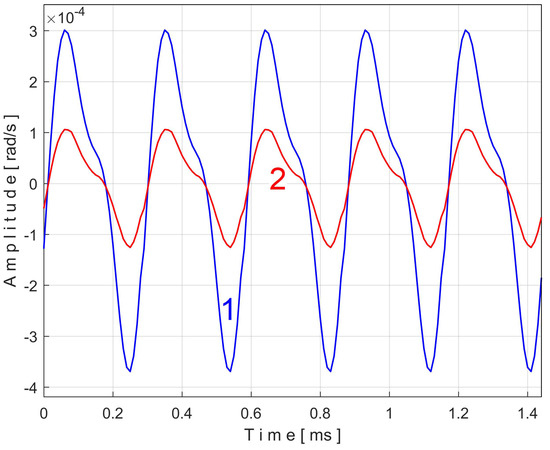 The extended patterns sPTMe5 generated by electric motor (m = 2465) during the new steady-state regime: 1—sPTMe5a, fPMa = 24.91988 Hz; 2—sPTMe5b, fPMb = 24.93528 Hz.