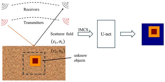 This study uses a half-wave dipole antenna to transmit microwave signals to detect unknown objects located in half-space by sensing the scattered field at the receivers, as shown in Figure 1. First, IMCS is used to generate a preliminary image from the sensed scattered field. This initial image is then input into the U-Net model for enhanced reconstruction, resulting in a high-resolution electromagnetic image. The key contributions of this article are as follows: