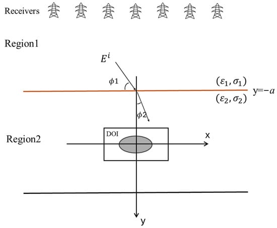 Figure 2 describes a dielectric (non-conductive) object situated in a lossy half-space, where the space can conduct electricity with some resistance. We have two regions in this space. In Regions 1 and 2, the permittivity and conductivity are , and , , respectively. Both regions have the same magnetic permeability as free space, denoted by . This means that we only consider non-magnetic materials. The object is illuminated by an incident transverse magnetic (TM) wave, i.e., the electric field is perpendicular to the direction of wave propagation, while the magnetic field has components in both the radial and axial directions. The incident wave has a time-harmonic nature, meaning its behavior over time can be expressed with a sinusoidal function and hits the object at an angle . This representation reflects the oscillating nature of the electromagnetic field.