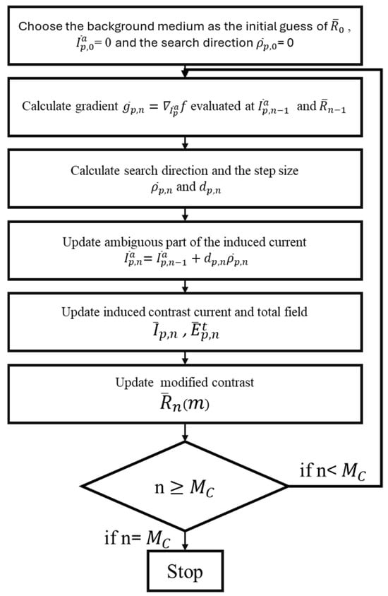 Let represent the forward problem solver, denote the regularization function, and be the constant regularization coefficient; is the number of incidences. The DOI is divided into subunits, enabling the application of the method of moments (MOM) with pulse basis functions and delta test. The center of each subunit is located at , . After discretization, the discretized form of (14) and (15) is obtained: