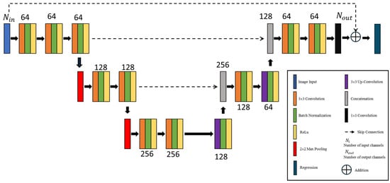 U-Net structure, as shown in Figure 4, has two main sections: a contracting path on the left and an expanding path on the right. The contracting path compresses the input by gradually reducing its spatial dimensions while capturing essential features. The expanding path then reconstructs the original dimensions by combining and refining these learned features to create a high-resolution output. In this structure, convolution layers identify the features of the input image. By sliding convolutional filters across the image, they generate feature maps that highlight important details. Batch normalization layers bring stability to the learning process by normalizing the inputs. While ReLU layers introduce non-linearity, enhancing the network’s capability to identify complicated patterns and make precise predictions. To decrease the dimensions of the feature maps and avoid overfitting, pooling layers perform down-sampling by selecting the highest values within small, non-overlapping regions of each feature map. This step, accomplished through a max-pooling layer in the contracting path, reduces both the data size and model parameters, facilitating faster training and enhancing efficiency. In the expanding path, spatial resolution is restored by an up-sampling layer using a up-convolution, effectively reversing the down-sampling and bringing back finer details.