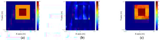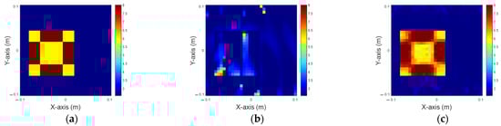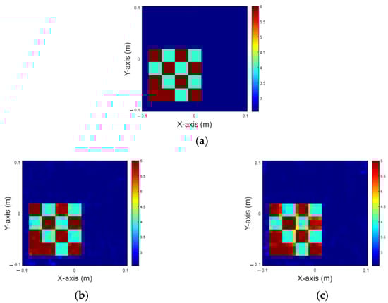 In this scenario, we analyze the distribution of the dielectric constant in the range of 8 to 10, with 5% noise added. Figure 7a illustrates the ground truth, while Figure 7b,c present the reconstructed images obtained by 200 iterations IMCS alone and U-Net with the IMCS add-on after three iterations, respectively. The related NRMSE and SSI values are summarized in Table 3. It is seen that both the inner and outer parts of the dielectric constant are not good by IMCS with 200 iterations. However, the image is fair by U-Net with three-iteration IMCS. Comparing these results with Figure 5 and Figure 6, as the dielectric constant increases, the reconstructed object becomes progressively blurrier.