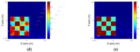 In this simulation, the dielectric coefficient is distributed between 4 and 6. A total of 32 transmitters and 32 receivers are deployed, and 5% Gaussian noise is added separately. It is assumed that the scatterers have 10 distinct permittivity distributions, which can be situated at any of 50 different locations in an interested domain. Consequently, there are 500 images (10 × 50) for each scenario. The dataset is split into 80% for training and the remaining 20% for testing. Finally, we evaluate the results recovered solely by 200-iteration IMCS and the U-Net using the IMCS with three iterations, shown in Figure 5. Since IMCS has not converged at 100 iterations, it always converged at the 200th iteration in our simulation. As a result, we set the maximum number of iterations as 200. The NRMSE and SSI of the recovered images are depicted in Table 1. As observed, the dielectric permittivity within the inner region of the image reconstructed by IMCS with 200 iterations is blurred but is clearer in the U-Net application. The results reveal that U-Net performs better in reconstructing the permittivity distribution within the inner region of the image.