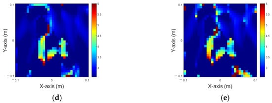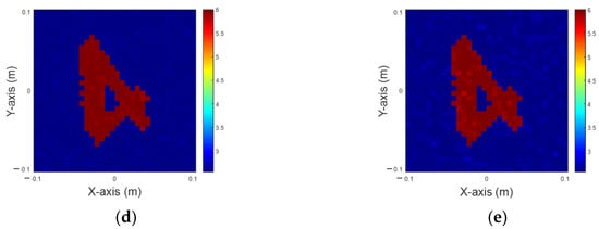 Reconstruction of permittivity at 6. (a) Ground truth; (b) with 5% Gaussian noise; (c) with 10% Gaussian noise; (d) with 15% Gaussian noise; (e) with 20% Gaussian noise.