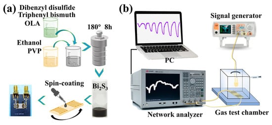 An amount of 50 μL of Bi2S3 nanoribbon solution was covered the central sensitive region (the delay region between input IDT and output IDT) of the SAW delay line device, ensuring complete coverage. Then, Bi2S3 was uniformly deposited on the surface of the SAW device by spin-coating at a rotational velocity of 1000 rpm for a duration of 90 s. The above steps were repeated to spin-coat two layers of Bi2S3 nanoribbon-sensitive films. Subsequently, a solution of Pb(NO3)2 in methanol (10 mg/mL) and pure methanol was deposited on the SAW sensor in an alternating manner, followed by a spin-coating at 1000 rpm for 100 s. This process was repeated thrice to ensure the removal of ligands that had been capping the surface of the Bi2S3 films to obtain a Pb(NO3)2-treated SAW H2S sensor. Similarly, Mg(NO3)2-treated, NaNO2-treated and Cu(NO3)2-treated SAW H2S sensors can be prepared separately.