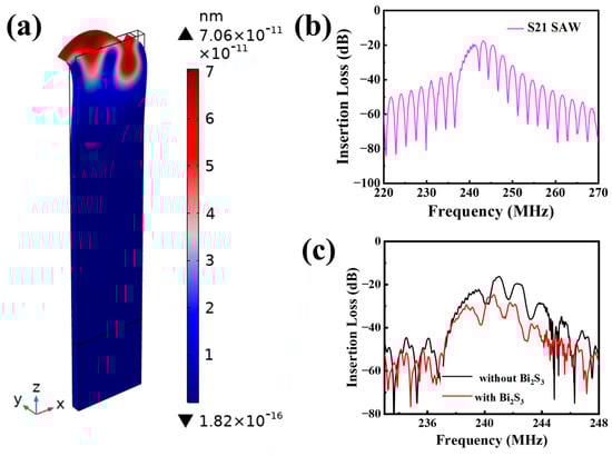 (a) Displacement of the SAW device under peak frequency excitation; (b) FEA-simulated S21 signals of the SAW device; (c) S21 signals of the fabricated SAW device before and after coated Bi2S3 films.