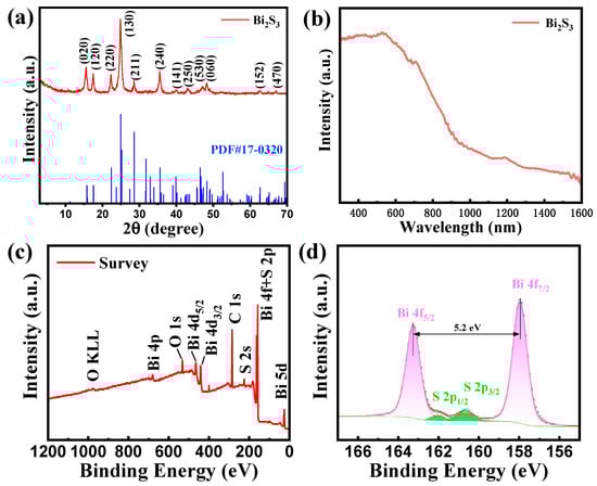 (a) XRD patterns of Bi2S3 nanoribbons; (b) absorption spectra of Bi2S3 nanoribbons; (c) overall XPS spectra of Bi2S3 nanoribbons; (d) focused XPS spectra of Bi 4f and S 2p.