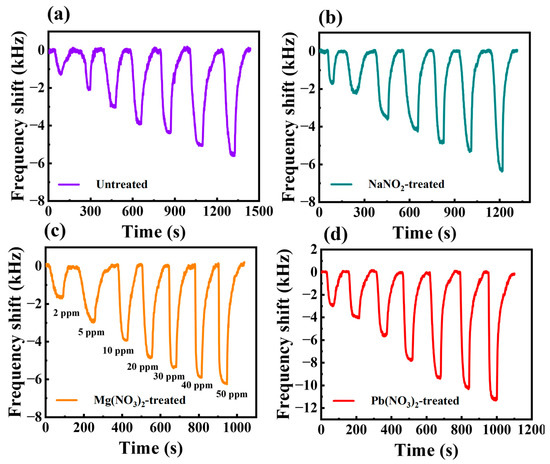Real-time response curves of the sensor to different concentrations of H2S for (a) unliganded substitution, (b) NaNO2 solution treatment, (c) Mg(NO3)2 solution treatment, (d) Pb(NO3)2 solution treatment.