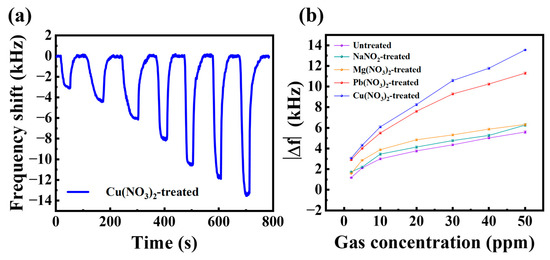 The real-time curve of the sensor response to different concentrations of H2S gas after Cu(NO3)2 ligand exchange treatment is shown in Figure 6a. The response of the sensor with different ligand exchange treatments compared with the untreated Bi2S3 nanoribbon sensor for different H2S gas concentrations is shown in Figure 6b. For different concentrations of H2S, the sensor exhibited an approximately linear response under 10 ppm. And with the increase of H2S concentration, the response of the sensors gradually tends to saturation, which may be due to the limited number of gas adsorption sites in the sensitive films leading to H2S adsorption saturation. Among them, as demonstrated in Figure 6b, the Cu(NO3)2-treated sensor exhibits the maximum response. This phenomenon may be attributed to the Cu ions exhibiting a preference for the adsorption of H2S gas, which has been confirmed in previous reports []. Therefore, the subsequent study was conducted on the basis of the Cu(NO3)2 solution treatment.