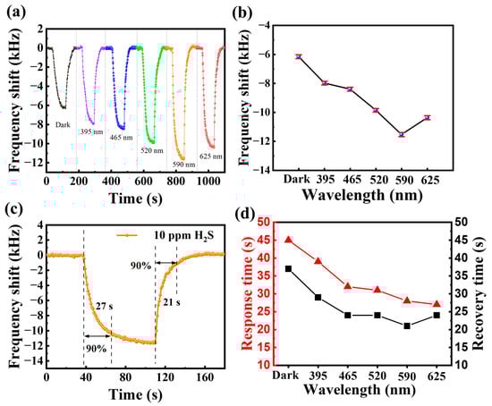 (a) Real-time response curve of Bi2S3 nanoribbon SAW sensor to 10 ppm H2S gas at different wavelength light-activated; (b) comparison plot of the responses of Bi2S3 nanoribbon SAW sensor to 10 ppm H2S gas at different wavelength light-activated; (c) response/recovery times to 10 ppm H2S at 590 nm light-activated; (d) comparison of sensor response/recovery times to 10 ppm H2S at different wavelength light-activated.