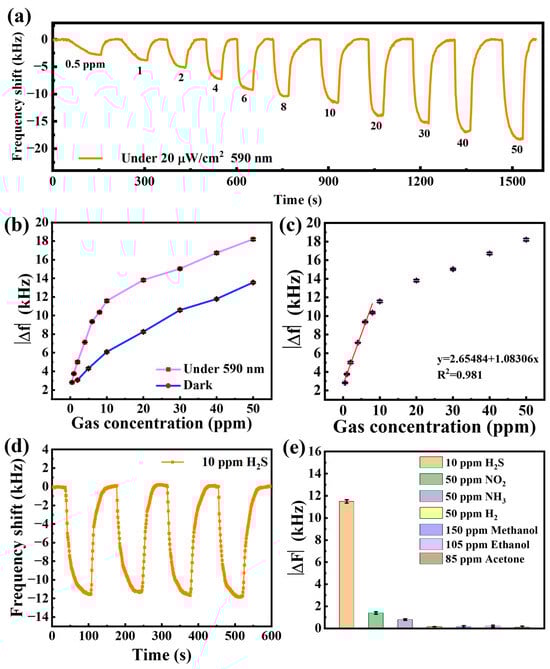 (a) Real-time response curve of the sensor to different concentrations of H2S at 590 nm light-activated; (b) comparison of sensor response to H2S under 590 nm light-activated and darkness; (c) frequency response of H2S at different concentrations under 590 nm light-activated; (d) repeatability of the sensor for 10 ppm H2S gas; (e) selectivity of the sensor.