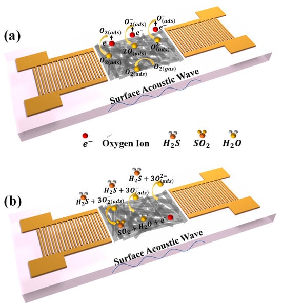 Upon exposure to H2S gas, the H2S molecules react with the adsorbed oxygen on the surface of the Bi2S3 nanoribbons, resulting in the release of electrons back to the Bi2S3 surface (Figure 9b). The process can be explained in detail by Equations (6)–(8), and the schematic is shown in Figure 9b. This process leads to changes in the mass and conductance of the sensitive film on the surface of the SAW sensor.