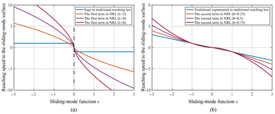For the first term in NRL (16), the rate convergence rate is contingent on the characteristics of the sliding-mode function s. When tends to infinity, . The enhanced reaching law exhibits a switching gain that surpasses the constant gain associated with the conventional isochronous term.